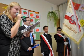 Następnie dyrektor uroczyście pasował każdego pierwszoklasistę wręczając mu akt pasowania na ucznia i legitymację szkolną. Obchody tego ważnego dnia uświetnił występ uczniów z klasy II, którzy przygotowali program artystyczny pod opieką Aleksandry Majkut. Wręczyli młodszym koleżankom i kolegom piękne upominki w postaci książek.