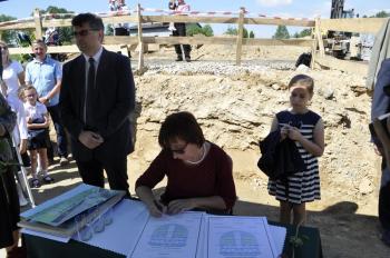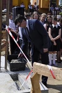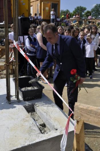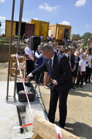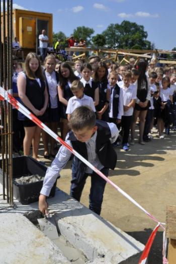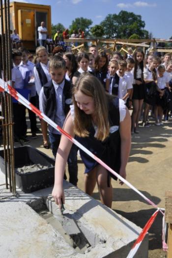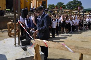 Kamień węgielny przybrał kształt kapsuły, która przeniesie w czasie dokumenty i świadectwa starań o nową szkołę w Porębie Wielkiej. 19 czerwca został on uroczyście wmurowany w fundamenty przez wójta Gminy Oświęcim Alberta Bartosza oraz przedstawicieli środowisk i instytucji, których działania sprawiły, że między parkiem a Domem Ludowym ruszyła budowa. O szczególnym charakterze uroczystości wymownie świadczy fakt, że zamiast o inwestycji wszyscy mówili tego dnia o spełnionym marzeniu.