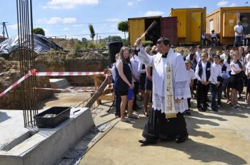 Tak przygotowany kamień węgielny został poświęcony przez księdza proboszcza Stanisława Sadlika i wmurowany rękami oddanych sprawie ludzi w fundament, na którym staną nowe szkolne mury w Porębie Wielkiej.
