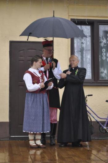 Podczas tańczonego z przytupem krakowiaka do Stawów Monowskich dotarł proboszcz, którego zatrzymały duszpasterskie obowiązki. Księdzu Dewerze również udzielił się pogodny – na przekór deszczowej aurze – nastrój: