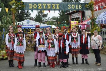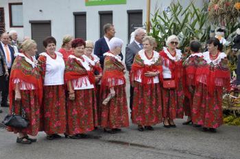 Tradycyjna pieśń "Plon niesiemy, plon" w wykonaniu Zespołu "Włosianeczki" poprzedziła przekazanie dożynkowych darów. Renata i Sławomir Kubulusowie pełniący rolę Gospodarzy uroczystości przyjęli wieniec i chleb z rąk młodych mieszkańców Włosienicy. Symboliczne bochny upieczone z tegorocznego ziarna odebrali też wójt Albert Bartosz i starosta Zbigniew Starzec.