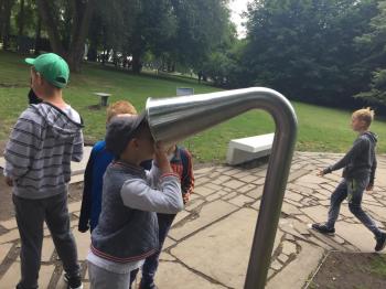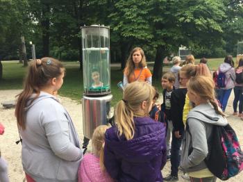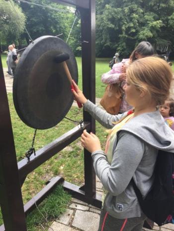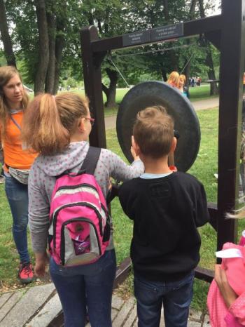 Po przybyciu do Krakowa miało miejsce zwiedzanie Ogrodu Doświadczeń im. Stanisława Lema, w którym mogliśmy poznać działanie praw przyrody i praw fizyki. Tam każdy może zostać odkrywcą i badaczem, co może stanowić ciekaw uzupełnienie procesu nauczania. Zobaczyliśmy m.in. telegraf akustyczny, kołyskę Newtona, kamienne cymbały, dzwony rurowe i lunetę obserwacyjną. Dowiedzieliśmy się m.in. jak działa siła odśrodkowa, siła Coriolisa oraz jak powstaje ruch wirowy. Oglądaliśmy też model Układu Słonecznego.