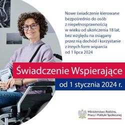 Z dniem 1 stycznia 2024 r. weszło w życie świadczenie wspierające. Jest to nowa forma pomocy osobom niepełnosprawnym mająca na celu częściowe pokrycie wydatków związanych z zaspokojeniem szczególnych potrzeb życiowych. Zobacz jak uzyskać wsparcie.