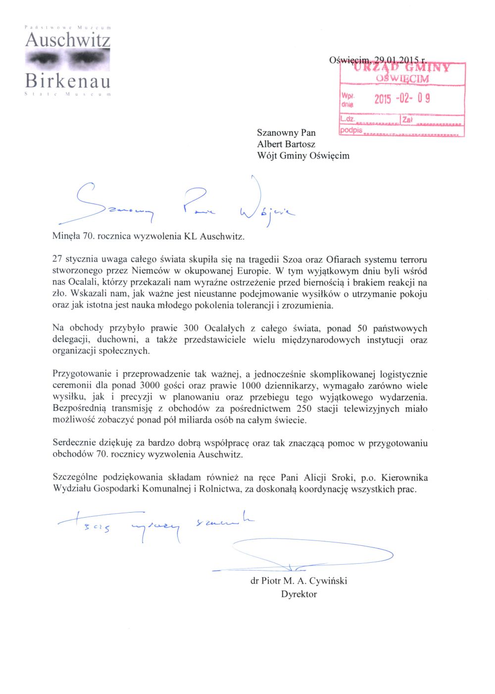 Podziękowania za pomoc w przygotowaniu obchodów 70. rocznicy wyzwolenia Auschwitz
