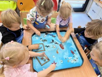 Na sali zrobiło się naprawdę morsko – dominował błękit oceanu, a wśród fal można było dostrzec morskie zwierzęta, które dzieci chętnie poznawały i naśladowały. Choć za oknem panowała deszczowa aura, w naszej sali było kolorowo, radośnie i bardzo kreatywnie.