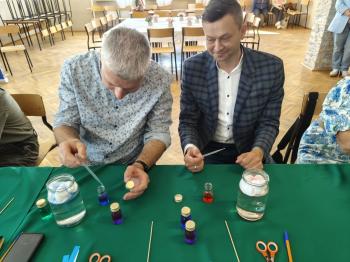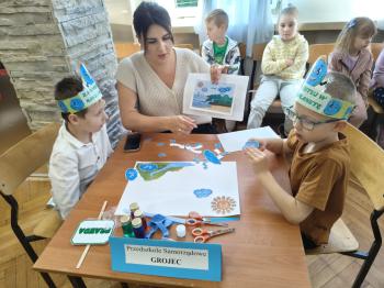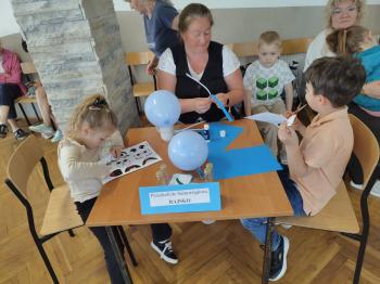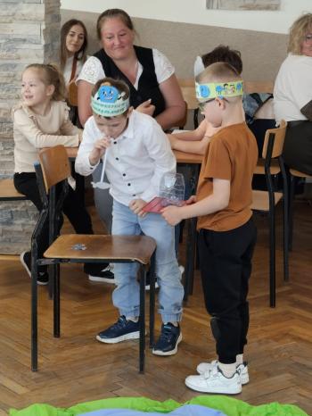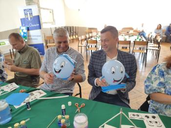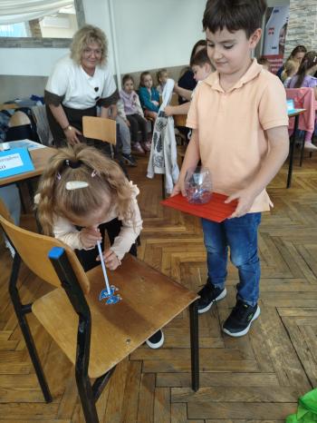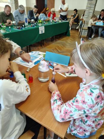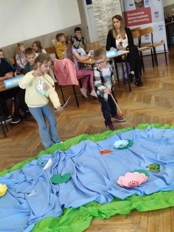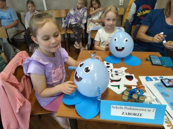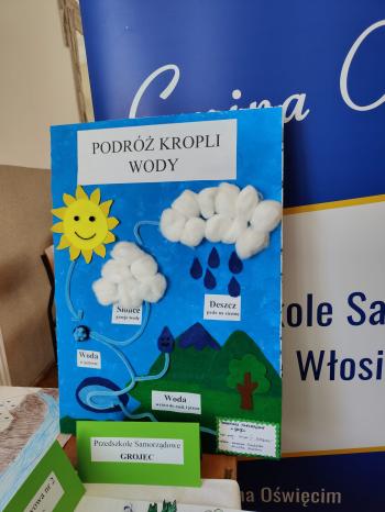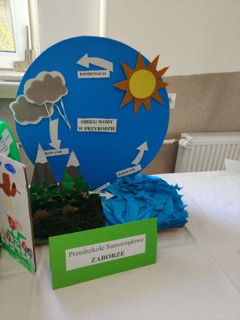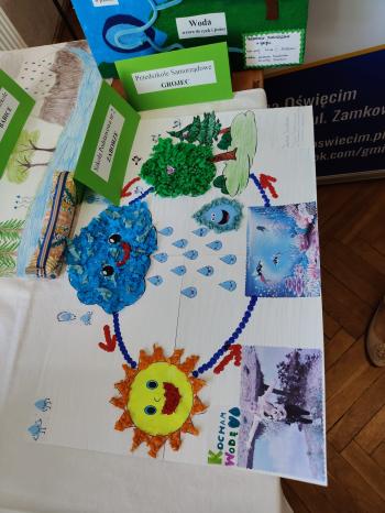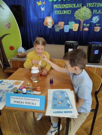 Przenoszenie kropelek wody przy pomocy rurek do picia, wykonywanie eksperymentu z kolorowym deszczem, tworzenie plakatu pt. „Obieg wody w przyrodzie”, stworzenie pracy plastycznej pt. „Kropelkowa woda”, oczyszczanie stawu – to tylko kilka zadań jakie miały do wykonania dzieci w trakcie rywalizacji konkursowej. Za każde poprawnie wykonane zadanie, przedszkolaki otrzymywały punkty i naklejały je na specjalną planszę. Każdą z konkurencji oceniała również komisja konkursowa w składzie: