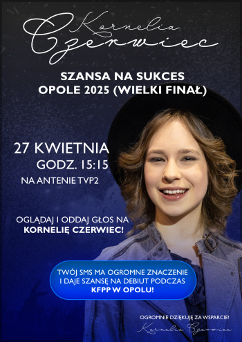 Z ogromną dumą informujemy, że Kornelia Czerwiec, zwyciężczyni pierwszej edycji Diamentów Kruszywa, wystąpi w wielkim finale Szansy na Sukces już w niedzielę, 27 kwietnia 2025 o godzinie 15:15 w TVP2!