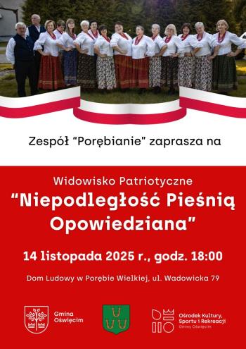 Podczas wydarzenia usłyszycie pieśni, piosenki oraz wiersze patriotyczne w wykonaniu Zespołu "Porębianie".