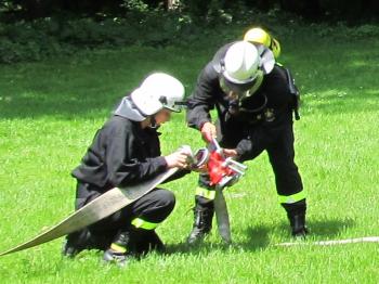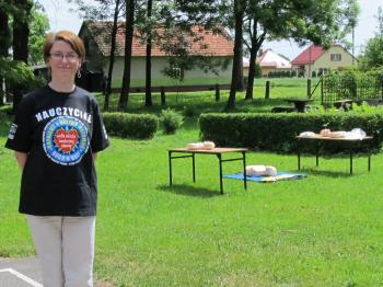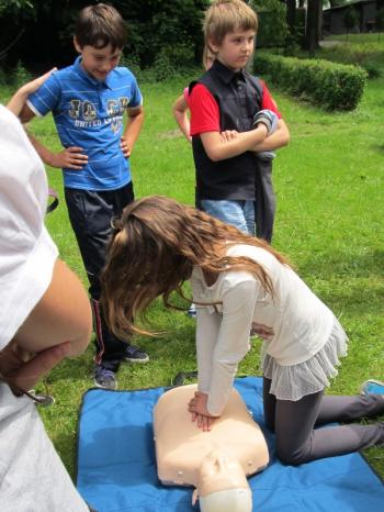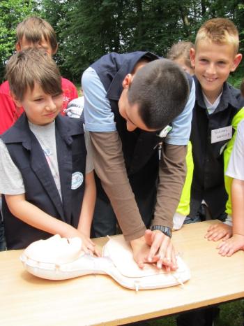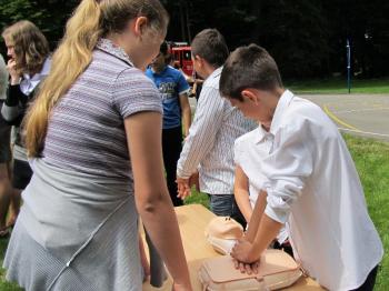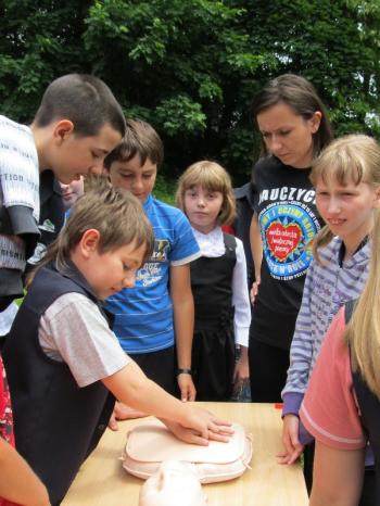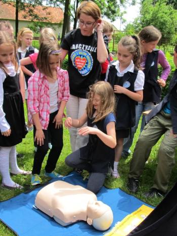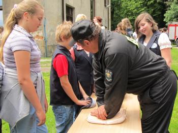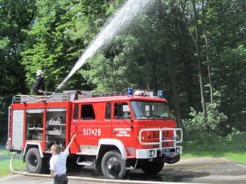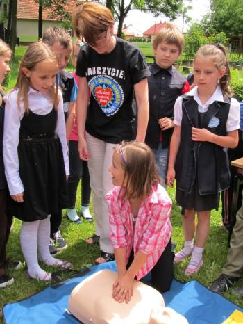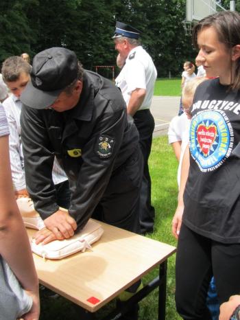 Następnie odbyły się pokazy przygotowane przez strażaków z OSP w Porębie Wielkiej. W ruch poszły węże i armatki strażackie i zainscenizowany pożar został ugaszony. Mały prysznic dosięgnął także wszystkich zgromadzonych na boisku szkolnym. Największą frajdę uczniom sprawiło siedzenie za kierownicą nowoczesnego wozu strażackiego. Wszyscy mieli również możliwość poćwiczenia udzielania pierwszej pomocy. Do tego celu przeszkoleni przez współpracowników Jurka Owsiaka nauczyciele wykorzystali fantomy, które szkoła otrzymała od Wielkiej Orkiestry Świątecznej Pomocy.