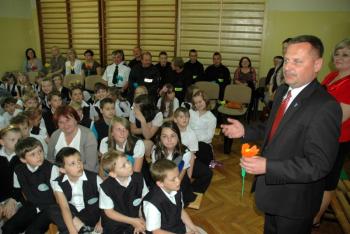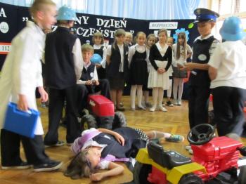Przybyłych gości powitała dyrektor szkoły Anna Szarzec. Następnie odbyła się część artystyczna. Uczniowie w inscenizacji zaimprowizowali wypadek drogowy, w którym pod koła jadącego samochodu wpada idące do szkoły dziecko. Natychmiast na sygnale pojawiły się: pogotowie ratunkowe, policja i straż pożarna. Potrąconemu dziecku fachowo udzielono pomocy, policjant spisał protokół powypadkowy, a lekarz i strażak odprowadzili poszkodowaną na pobocze. Następnie słowami wierszy i piosenek mali artyści opisali pracę tych trzech służb i podziękowali za ich trud oraz opiekę na co dzień. Dodatkowym wyrazem wdzięczności były kwiaty ze słodką niespodzianką oraz serdeczne życzenia dla gości, którzy wyrazili uznanie dla umiejętności aktorskich dzieci i przekazali dla nich słodycze.