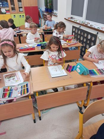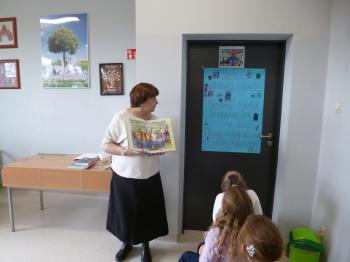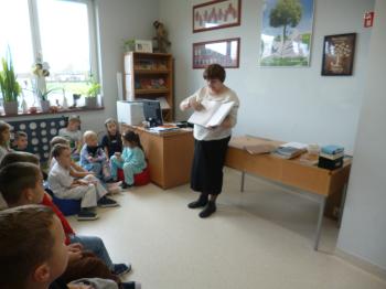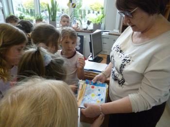 Dzieciaki chętnie odpowiadały na pytania pani bibliotekarki np. jakie książki czytają, czy warto czytać, czy często wypożyczają książki i czy lubią czytać. Spotkanie miało na celu przybliżenie najmłodszym roli biblioteki w życiu szkoły, zachęcenie do czytania książek oraz rozwijanie zainteresowań czytelniczych.
