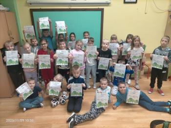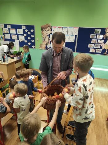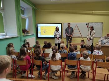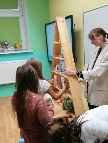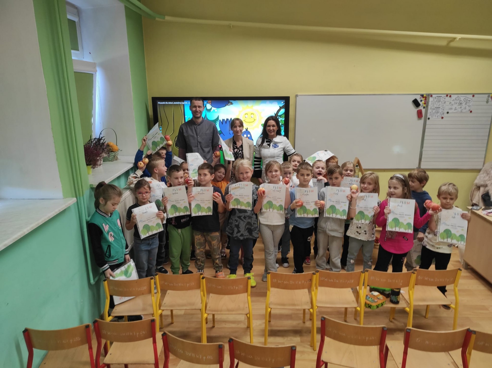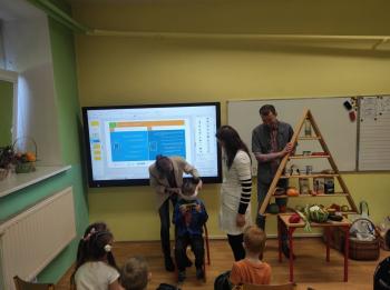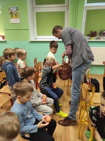 Omawiając piramidę żywienia zaprosili dzieciaki do aktywnego uczestnictwa i każdy osobiście mógł umieścić wybrany artykuł w odpowiednim miejscu naszej piramidy. Dodatkowo uczniowie za pomocą zmysłów: dotyku i węchu starały się, z zawiązanymi oczami, rozpoznać wręczony im owoc czy warzywo. Wszyscy zdali egzamin na piątkę wykazując się również doskonałą wiedzą przy rozwiązywaniu zagadek tematycznych czy udzielaniu odpowiedzi na , czasami wcale niełatwe, pytania. Na koniec spotkania wszyscy otrzymali zdrową przekąskę w postaci pysznego, soczystego jabłuszka. Mamy nadzieję, że zdobyta dziś wiedza pomoże naszym uczniom zmienić nawyki żywieniowe i zdrowo się odżywiać, nie zapominając o aktywności fizycznej każdego dnia. Pani Natalio, Żaneto i panie Andrzeju- jeszcze raz serdecznie dziękujemy.