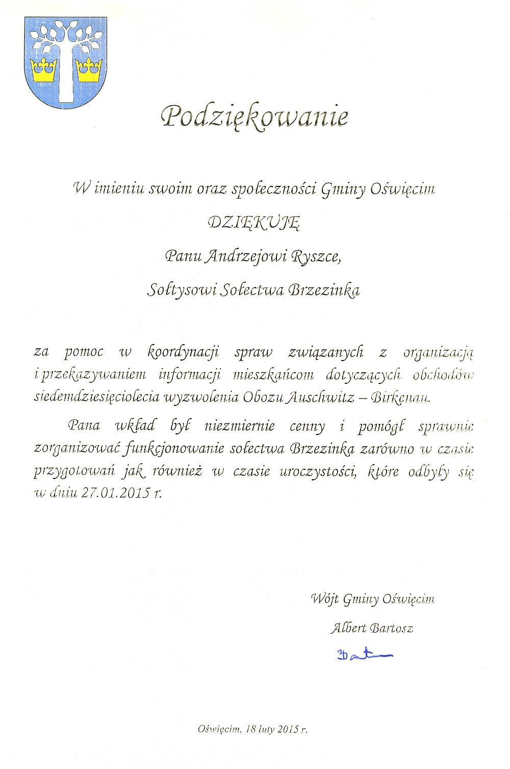 W imieniu swoim oraz społeczności Gminy Oświęcim Dziękuję Panu Andrzejowi Ryszce Sołtysowi Sołectwa Brzezinka za pomoc w koordynacji spraw związanych z organizacja i przekazywaniem informacji mieszkańcom dotyczących obchodów siedemdziesięciolecia wyzwolenia Obozu Auschwitz-Birkenau ....