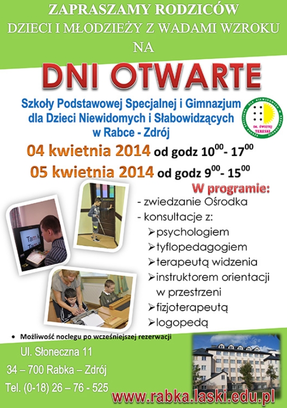 Zapraszamy Rodziców Dzieci i Młodzieży na dni otwarte Szkoły Specjalnej Podstawowej i Gimnazjum dla Dzieci Niewidomych i Słabowidzących w Rabce-Zdroju w dniach: 04 kwietnia (piątek) od godz. 10:00 - 17:00 05 kwietnia (sobota) od godz. 9:00 - 15:00 ...