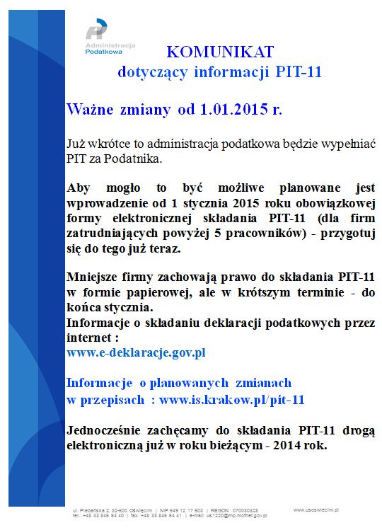 Komunikat Urzędu Skarbowego w Oświęcimiu dot. PIT-11