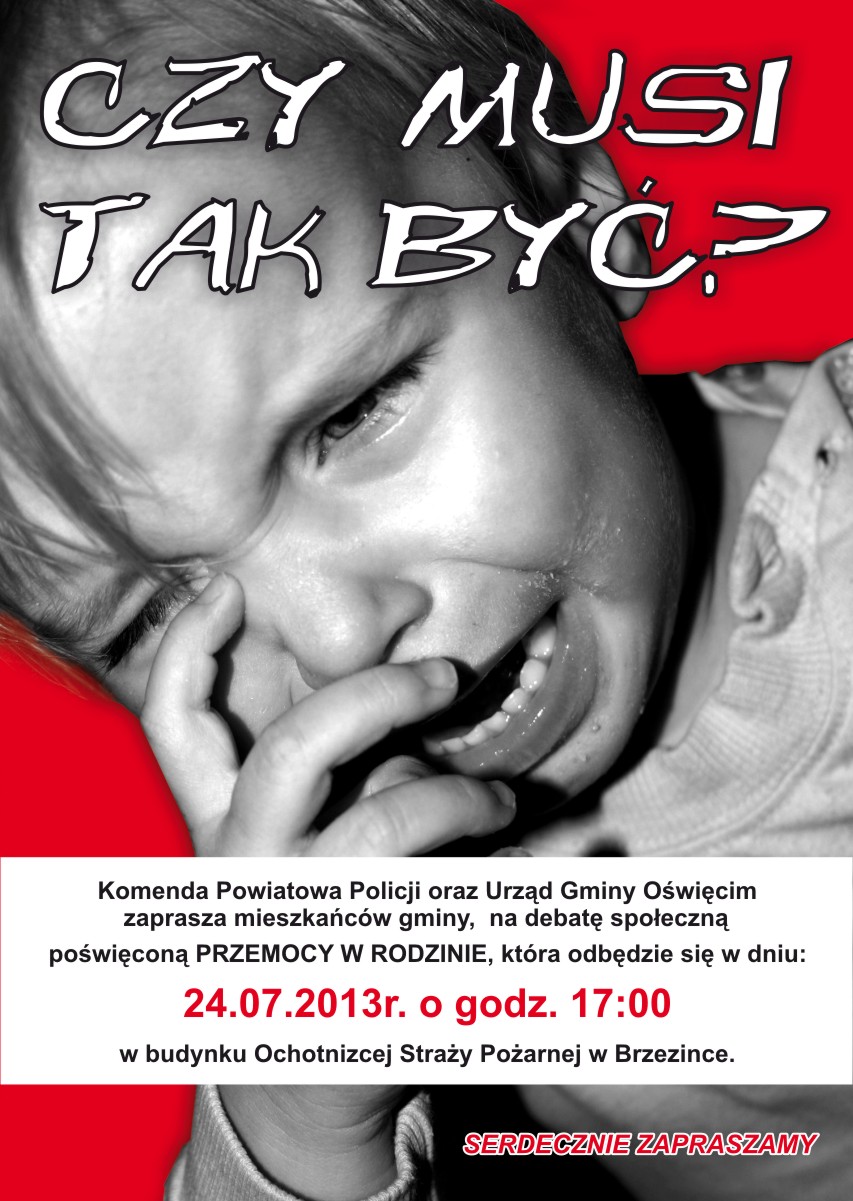 Komenda Powiatowa Policji oraz Urząd Gminy Oświęcim zapraszają wszystkich mieszkańców Gminy na debatę społeczną poświęconą przemocy w rodzinie. Debata odbędzie się w dniu 24 lipca 2013 o godz. 17:00 w budynku OSP w Brzezince ...