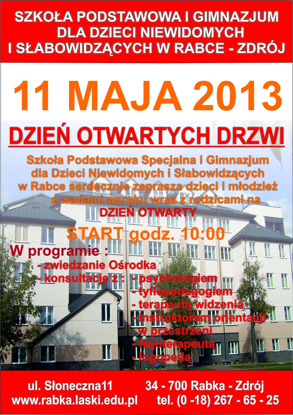 Szkoła Podstawowa i Gimnazjum dla Dzieci Niewidomych i Słabowidzących w Rabce Zdrój serdecznie zaprasza dzieci i młodzież z wadami wzroku wraz z rodzicami i wszystkich zainteresowanych na Dzień Otwarty 11 maja 2013r. ...