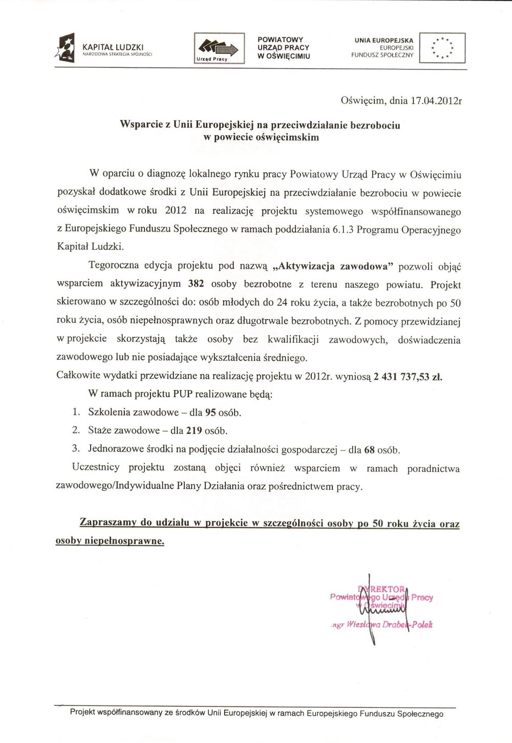 W oparciu o diagnozę lokalnego rynku pracy Powiatowy Urząd Pracy w Oświęcimiu pozyskał dodatkowe środki z Unii Europejskiej na przeciwdziałanie bezrobociu w powiecie oświęcimskim w 2012 roku ...