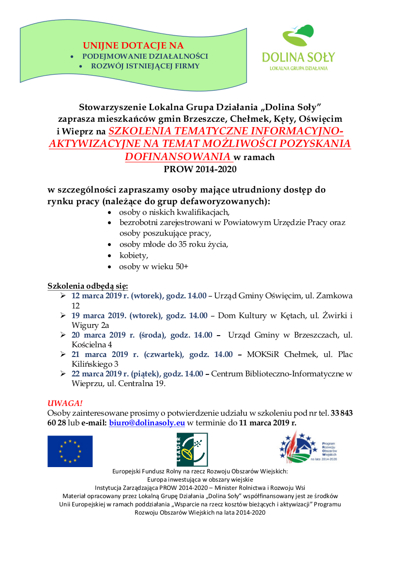 Stowarzyszenie Lokalna Grupa Działania "Dolina Soły" zaprasza na szkolenia tematyczne informacyjno-aktywizacyjne na temat możliwości otrzymania dofinansowania w ramach PROW 2014-2020. Zapraszamy do Urzędu Gminy Oświęcim (ul. Zamkowa 12, 32-600 Oświęcim) 12 marca na godz. 14.00