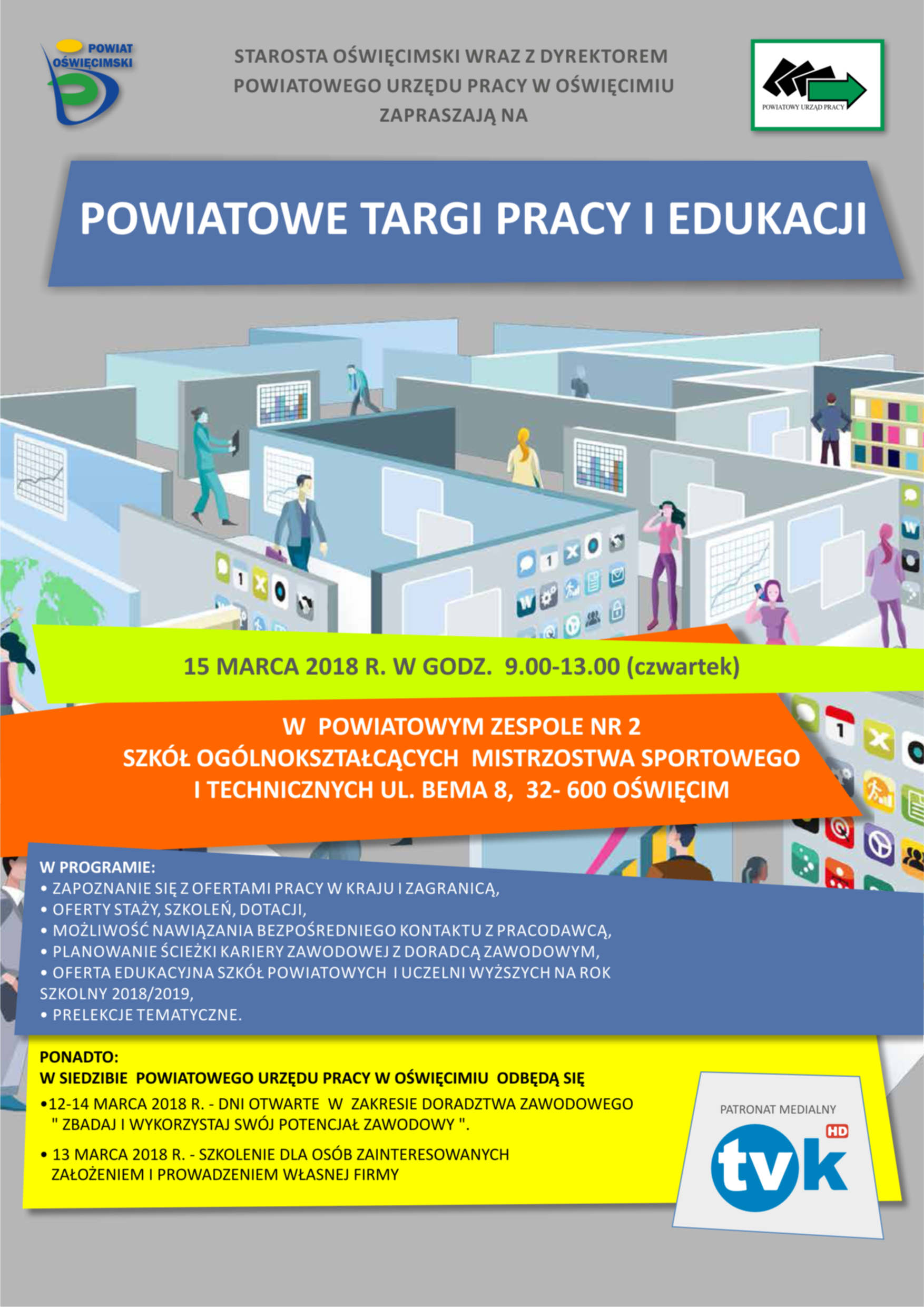 Starosta Oświęcimski wraz z Dyrektorem Powiatowego Urzędu Pracy w Oświęcimiu zapraszają na Powiatowe Targi Pracy i Edukacji, które odbędą się 15 marca 2018 roku w Powiatowym Zespole nr 2 Szkół Ogólnokształcących Mistrzostwa Sportowego i Technicznych, ul. Bema 8, 32-600 Oświęcim.