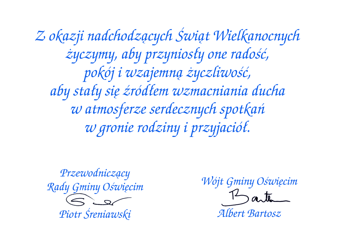 Z okazji nadchodzących Świąt Wielkanocnych życzymy, aby przyniosły one radość, pokój i wzajemną życzliwość, aby stały się źródłem wzmacniania ducha w atmosferze serdecznych spotkań w gronie rodziny i przyjaciół.