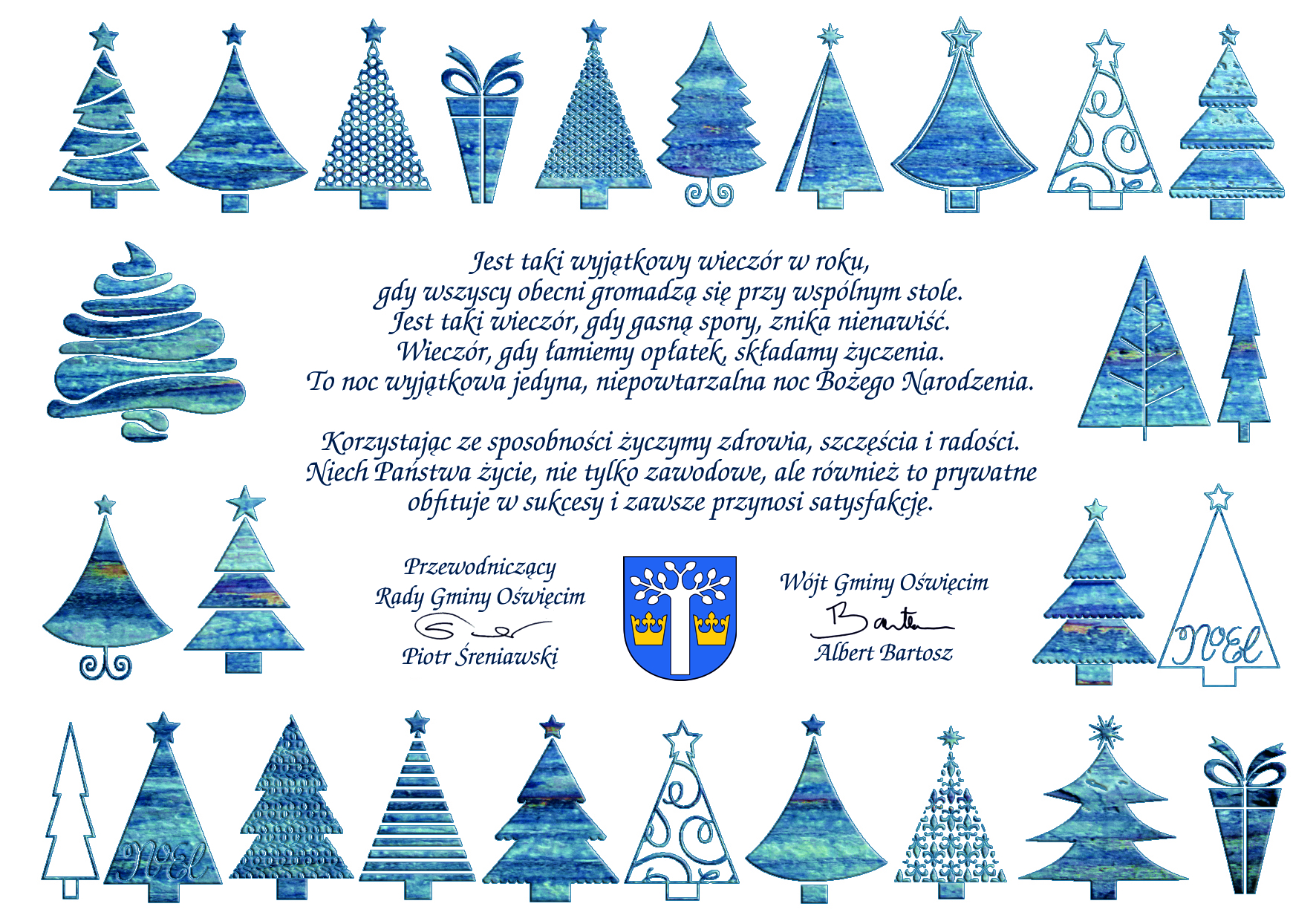 Wójt Gminy Oświęcim Albert Bartosz wraz z Przewodniczącym Rady Gminy Oświęcim Piotrem Śreniawskim pragną złożyć Państwu najserdeczniejsze życzenia z okazji Świąt Bożego Narodzenia.