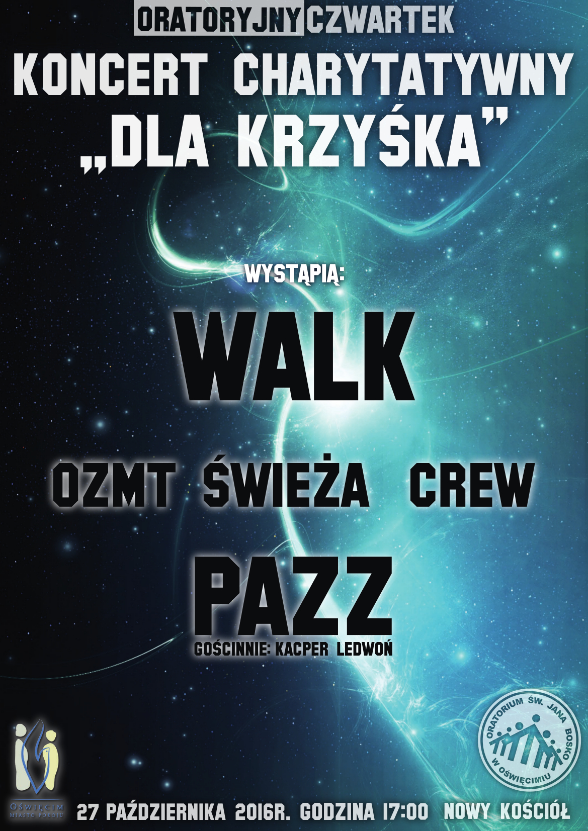 Już w najbliższy czwartek 27 października 2016 r. o godzinie 17:00 odbędzie się charytatywny koncert "Dla Krzyśka Węgrzyna". Miejsce koncertu to nowy Kościół u Salezjan, organizator Oratorium św. Jana Bosko w Oświęcimiu. Młodzi muzycy zapraszają . Pomóżmy Krzyśkowi!