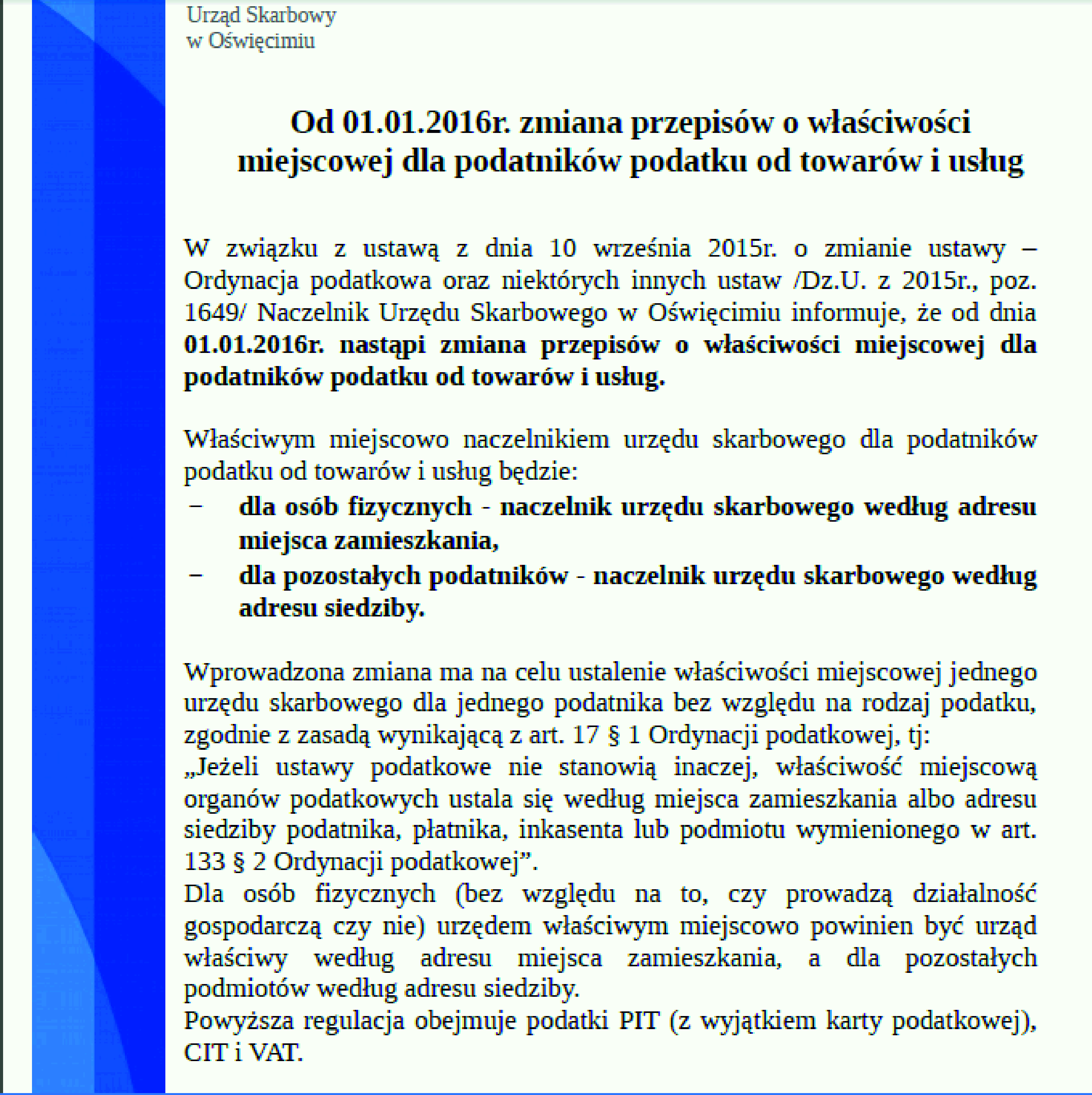 W związku z ustawą z dnia 10 września 2015r. o zmianie ustawy – Ordynacja podatkowa oraz niektórych innych ustaw /Dz.U. z 2015r., poz. 1649/ Naczelnik Urzędu Skarbowego w Oświęcimiu informuje, że od dnia 01.01.2016r. nastąpi zmiana przepisów o właściwości miejscowej dla podatników podatku od towarów i usług...